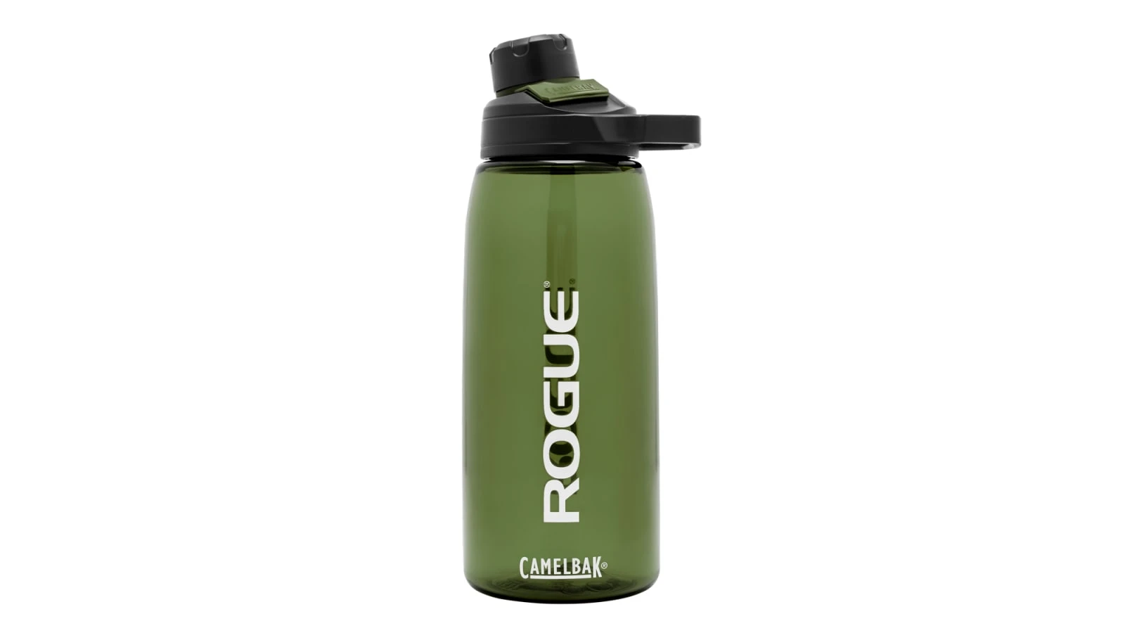 This Rogue branded version of the latest Camelbak ChuteĀ® Mag is available here in a translucent Olive colorway with a matte black universal cap + carry handle. The cap is equipped with a unique magnetic top that stows securely out of the way when open and is leak-proof when closed.