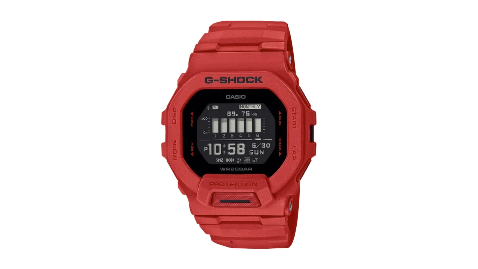 The shock-resistant and water-resistant GBD200RD-4 features a high-definition MIP LCD display with Super Illuminator face illumination for easy reading in the dark. The soft urethane band material provides improved comfort, while a large number of band holes let you adjust the fit to your particular wrist. Available here in vibrant red.