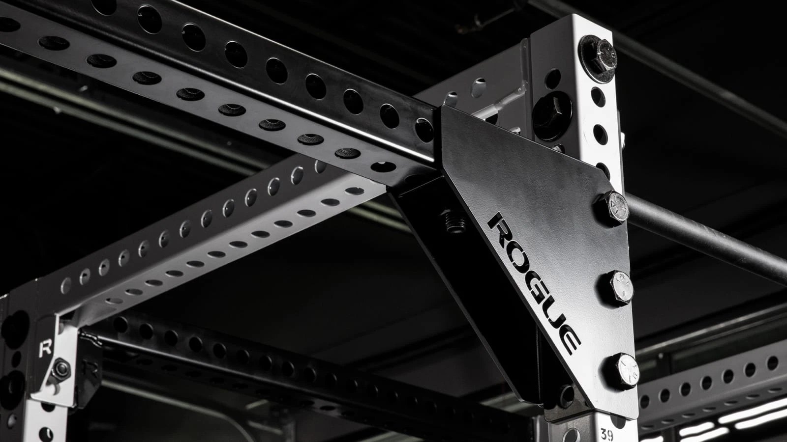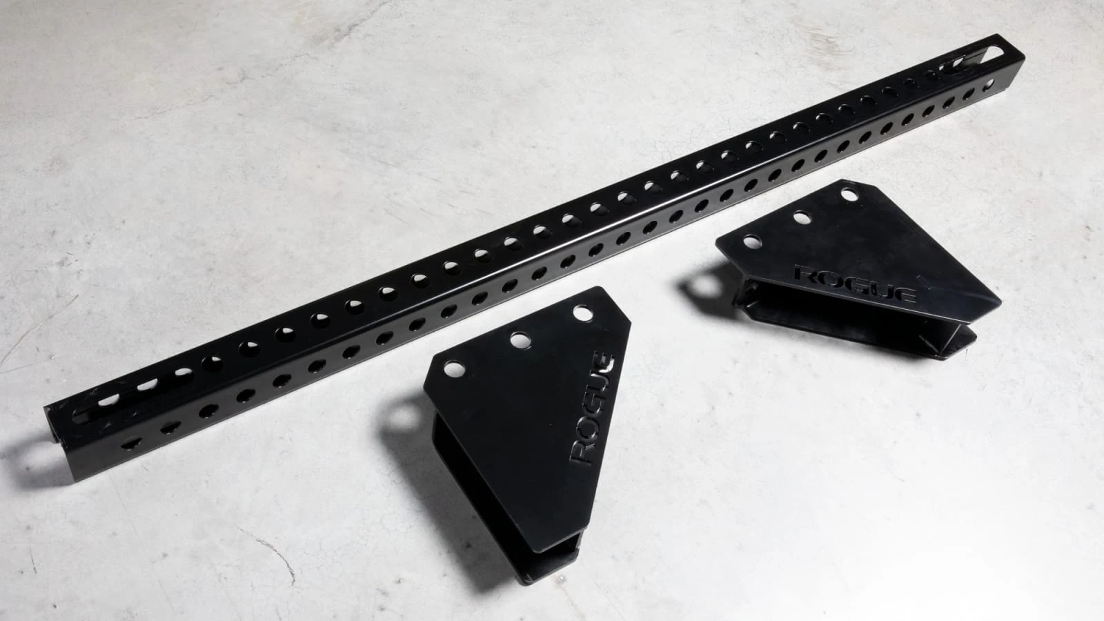 The heavy-duty, 1/4″ thick steel brackets, which include laser-cut Rogue branding, are overbuilt for maximum stability, eliminating movement across a chain of racks. An MG Black Powdercoat finish is used for both the crossmember and the brackets.