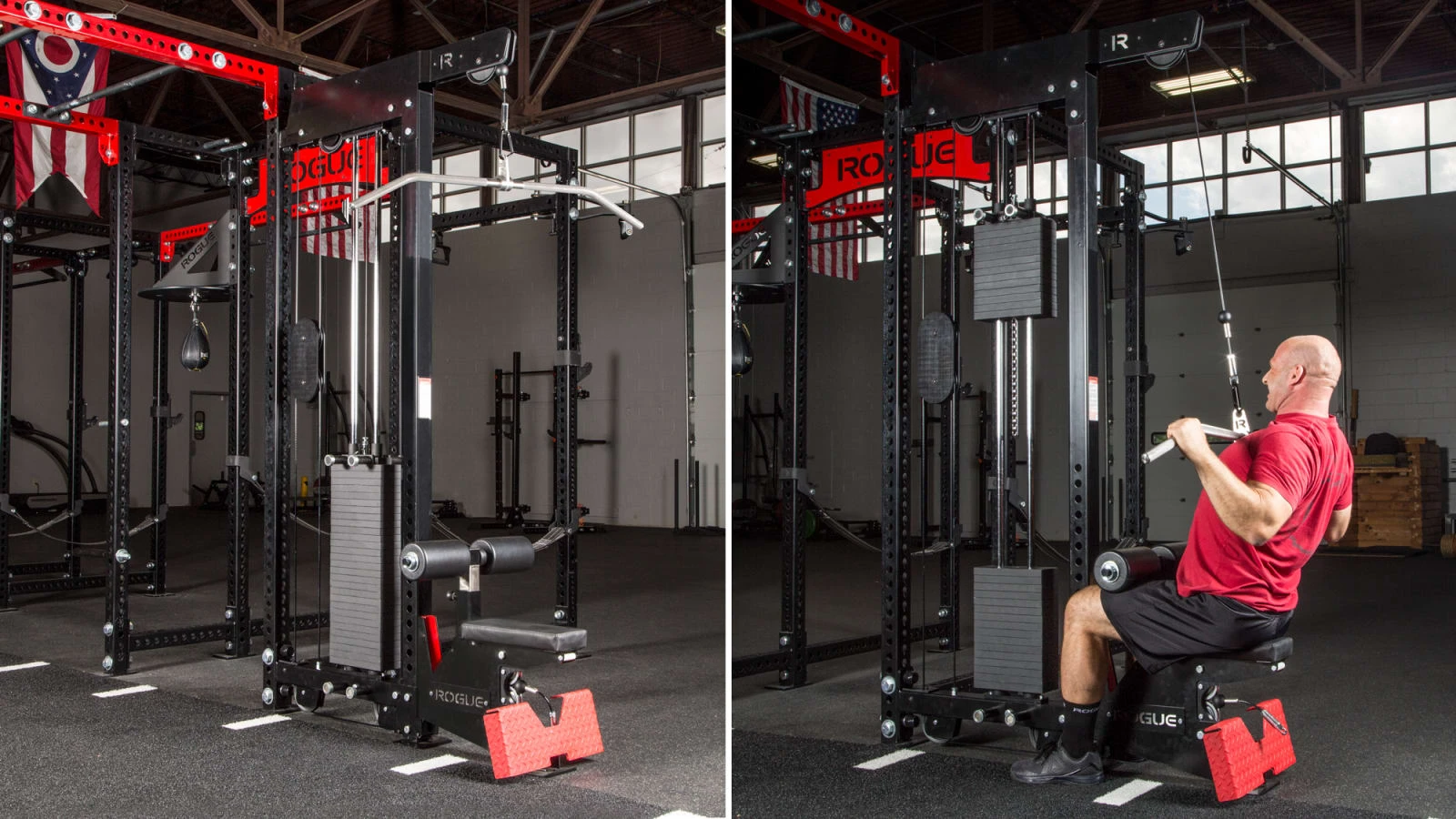 This is the rack-mounted version of Rogue’s Monster Lat Pulldown and Low Row machine (a stand-alone version is also available). Compatible with any existing 3×3″ Monster Series rack or rig, this 8′ tall add-on ships fully assembled, and includes a 300LB weight stack (10LB increments), stainless steel lat bar, diamond-tread adjustable footplate, 6″ nylon pulleys, and a set of custom-built black carabiners—one each for the lat pulldown and the low row.