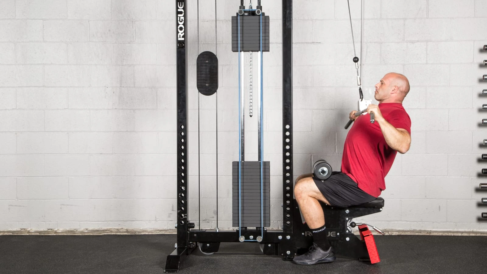 This is the fully updated, freestanding version of Rogue’s Monster Lat Pulldown and Low Row machine (a rack-mounted version is also available). Occupying just a 40″ x 60″ footprint, the 8′ tall unit ships fully assembled, and includes a 300LB weight stack (10LB increments), stainless steel lat bar, diamond-tread adjustable footplate, 6″ nylon pulleys, and a set of custom-built black carabiners—one each for the lat pulldown and the low row.