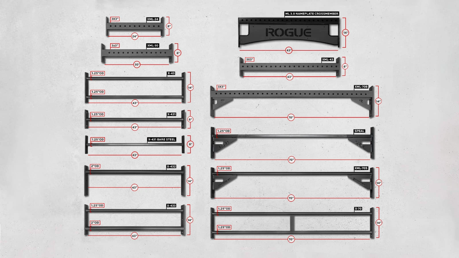 Rogue manufactures a wide range of crossmembers and pull-up bars that are compatible with our Monster Lite Series and available here for individual or combination orders. This includes some of our standard Infinity Crossmembers, as well as a line of bars designed specifically for the 3×3” dimensions of the Monster Lite upright.