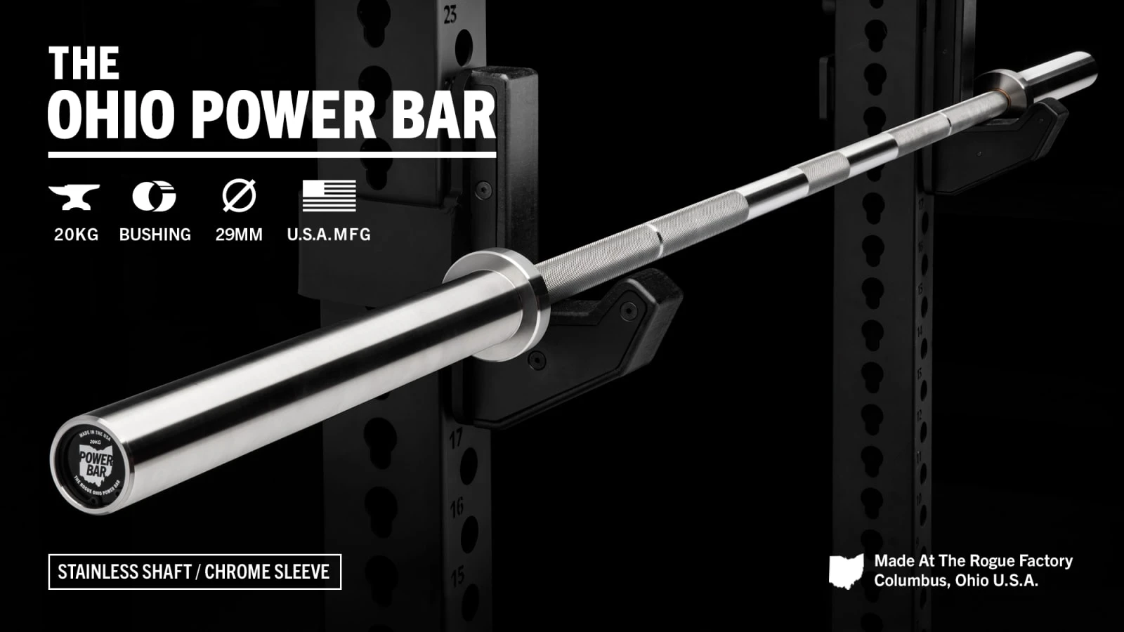 The 20KG Rogue Ohio Power Bar includes bronze bushings, a snap ring design, and a Stainless Steel shaft with Chrome sleeves.