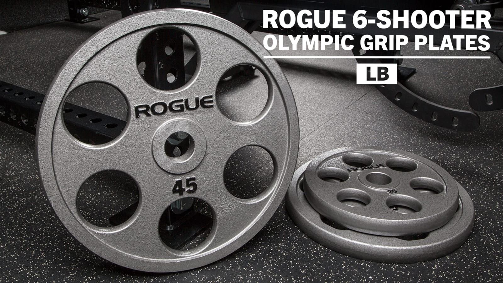 Each 6-Shooter Olympic Grip Plate includes LB markings, exclusive Rogue branding, and a 2ā diameter collar opening for compatibility on any standard Oly barbell. The smaller 6-Shooter change plates (2.5LB, 5LB, and 10LB) include a center hole only, without the additional six-hole pattern.