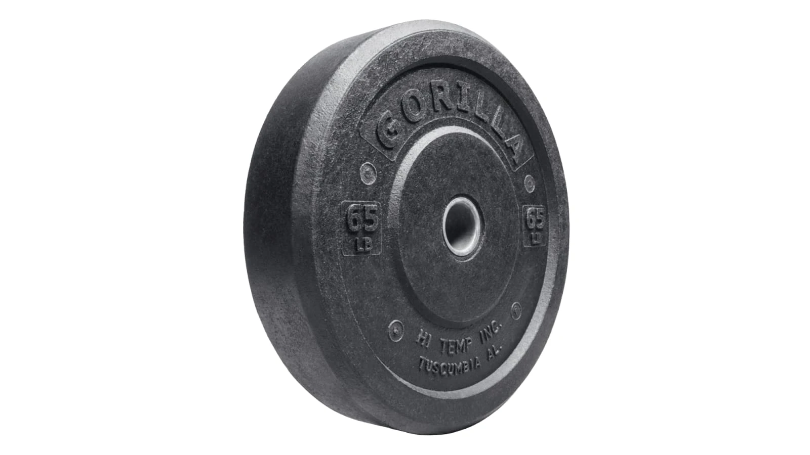 Rogue Gorilla bumpers are 65LB and just 4″ thick (compared to the standard 45LB plate at 3.75″). These have a slightly higher density than standard Rogue Hi-Temp bumpers that allows more weight in less space. A standard Olympic barbell can fit 4 Gorilla bumpers per side without collars which equals a total bar load of 565LB! Â