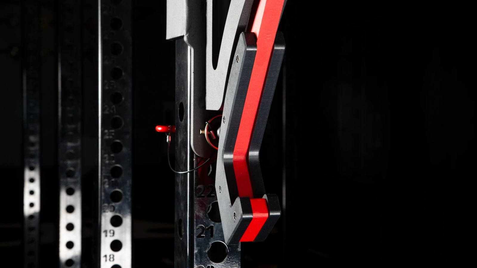 Each Adjustable Monolift set includes a pair of rack-mounted brackets with 0.75″ thick steel Jaw hooks. These hooks are designed with special counterweight handles at the top, so when you lift a barbell off the Monolift, the hooks will swing several inches back toward the rack and stay there. This clears up enough extra space to go straight into your workout, and also enables safe re-racking, as the slanted angle of the unloaded hooks makes it easy to guide the bar in, swinging the Monolift back into its original position. A pair of 1” hitch pins is also included in every order to lock the unit into place and prevent any unwanted swinging out.
