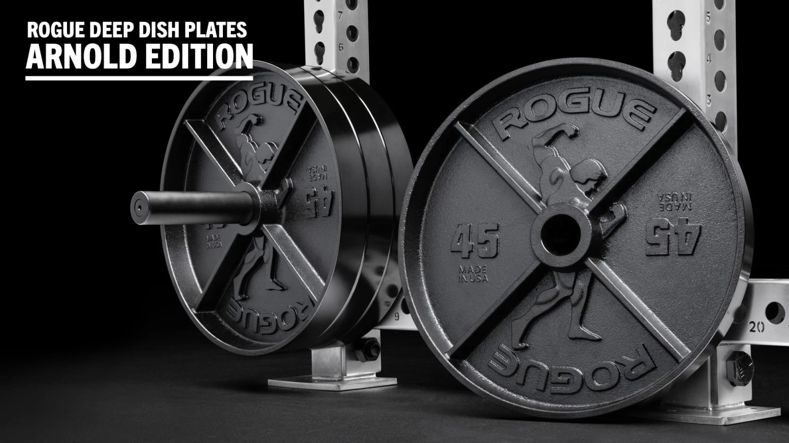 Distinguished by the iconic Schwarzenegger silhouette embossed between the weight indications, each Rogue Arnold Deep Dish Plate also includes a machined outer rim, back face, and center hub in the vintage style, with a 450mm outside diameter, 50mm width, and a strict weight tolerance of +2% / -0%. They are available to order as singles or in packs, and are produced exclusively in the 45LB weight increment.