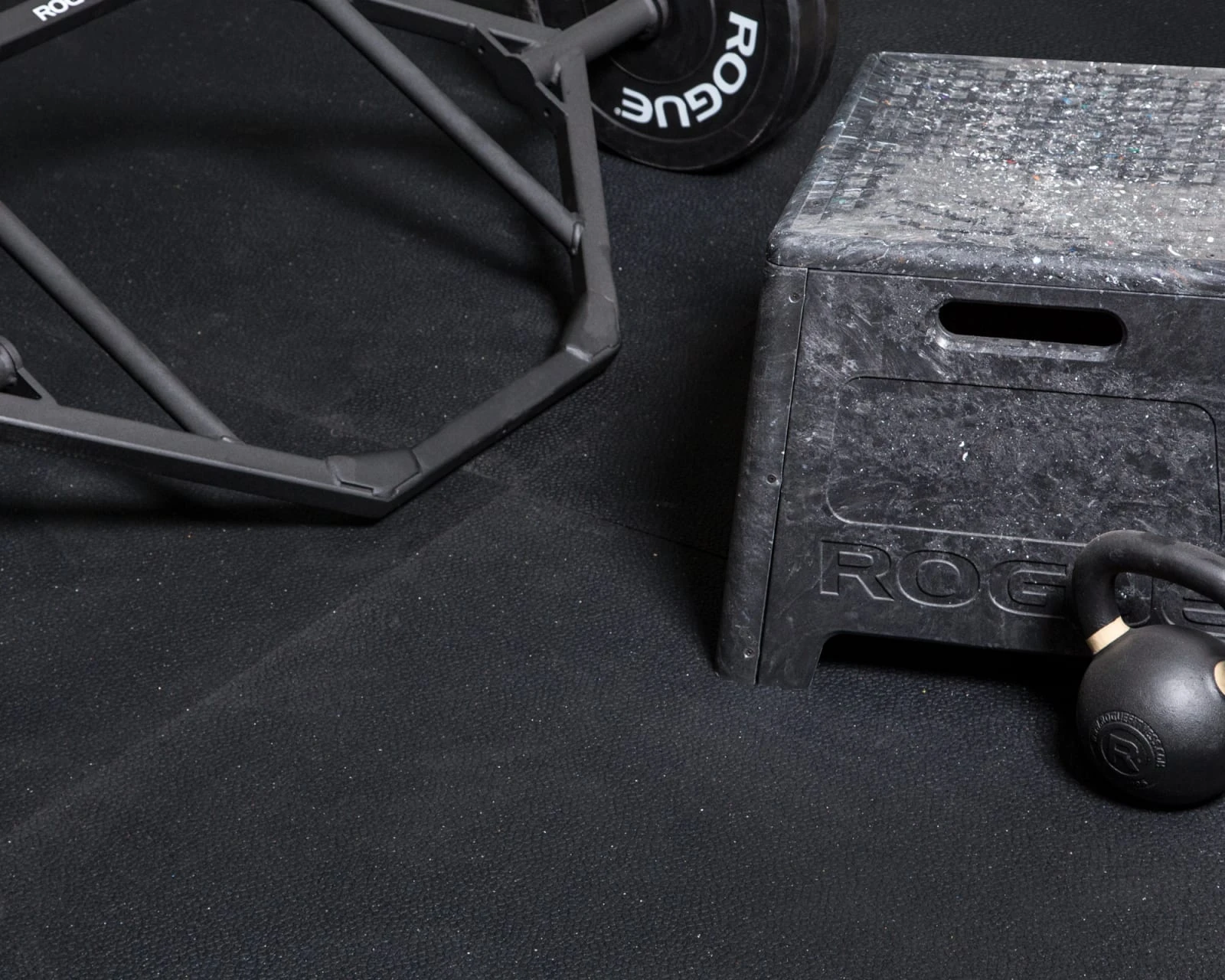 The updated Rogue Gym Mat is manufactured from a heavy-duty, nearly indestructible rubber matting used regularly in the agricultural and shipping industries. Each 6′ x 4′ mat is 3/4” thick for ample impact resistance and includes pre-trimmed edges for easily lining up multiple mats on a gym floor. A “pebble” style top surface and grooved bottom help provide a stable platform and grip with improved drainage.