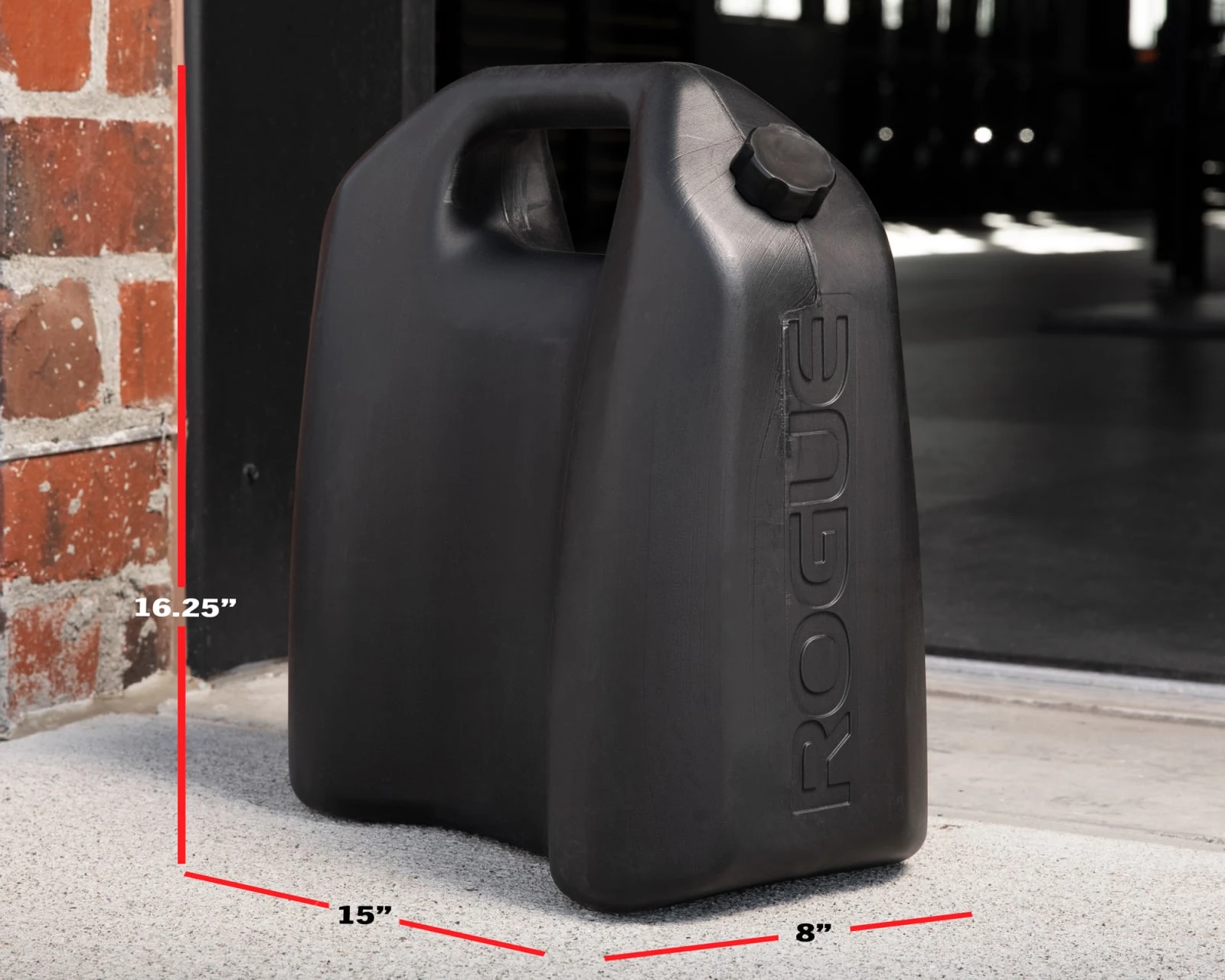 Rogue Jerry Cans are manufactured using the rotomold process, and feature a 4mm thick HDPE shell with a cap and interior rubber gasket for a leak-resistant seal. The rounded handle measures 1.5″ x 1.25″, and the can’s compact overall dimensions (15” L x 16.25” H x 8” W) and light weight (3.35 LBS unloaded) make it conveniently portable for use in or outside of the gym.