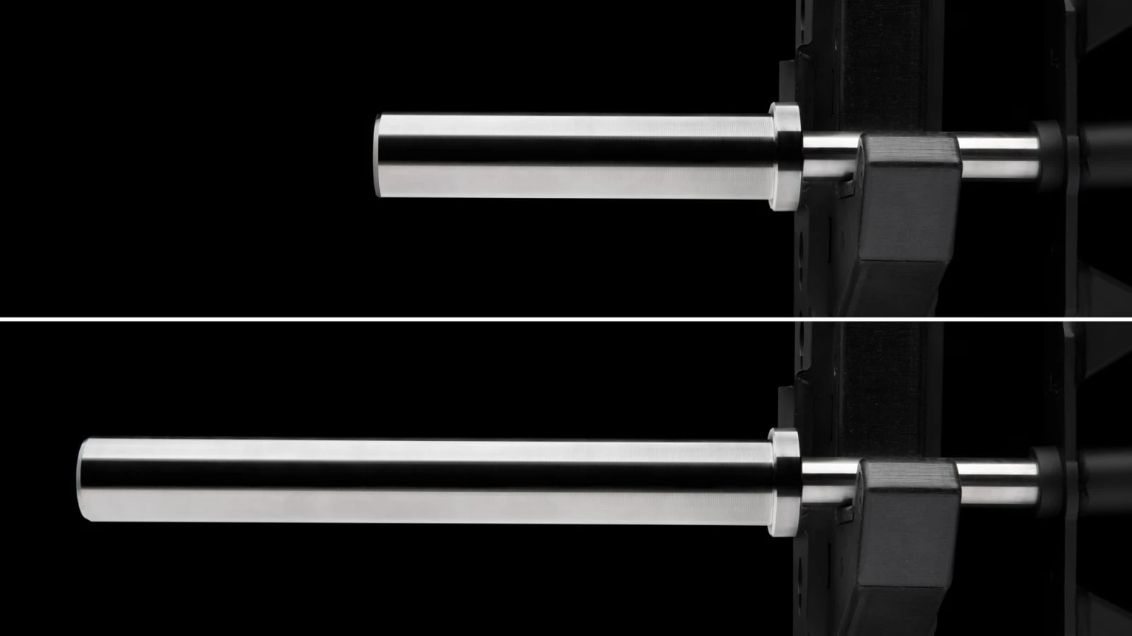 The 41” frame portion of the bar has been improved with this model, as well; built from 1.5” x 1.5” 11-gauge steel tubing with 1/4” plates, a machined socket, and a matte black powder coat finish. The sleeves are assembled to the shafts by our barbell assembly team, but to save on shipping costs, we developed a unique interlocking taper design that allows for easy assembly with a single nut using the included wrench. The joint created by this interlocking taper is every bit as strong as a weld, and will hold up to whatever an athlete throws at it. Even after the nut is removed, it takes a lot of force with a mallet to free the shaft from the socket (something to keep in mind if you decide to change to a different sleeve length at a later date).