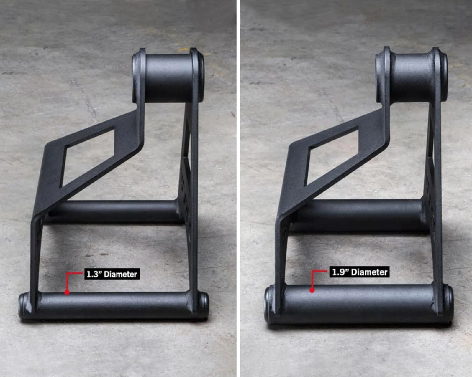 Rogue’s Parallel Landmine Handles can be used in conjunction with either the Rogue Landmine, Post Landmine, or Monster Landmine. Available with your diameter choice of 1.9″ fat grip, 1.3″ standard, this compact attachment slides securely over the end of any Olympic barbell in the same manner as our original Landmine Handles. The difference is in the design, as the Parallel Handles feature more of a triangular, row-handle inspired shape, with laser-cut steel plating similar to our Monster Grip Triangle.