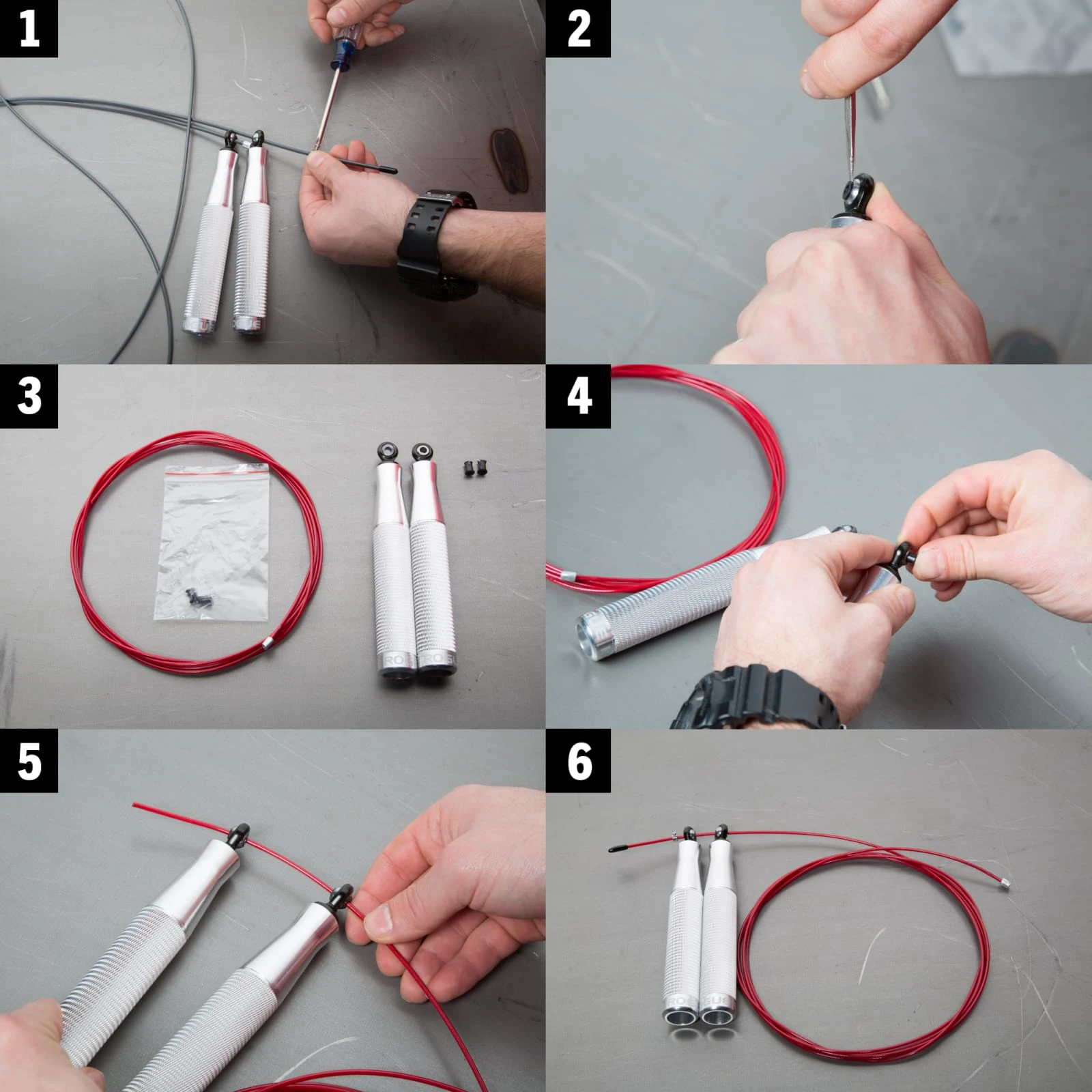 The PRO Aluminum Jump Rope comes standard with a 3.2MM Polyurethane cable. If you are purchasing a different diameter replacement cable, you will need to follow the steps below:
