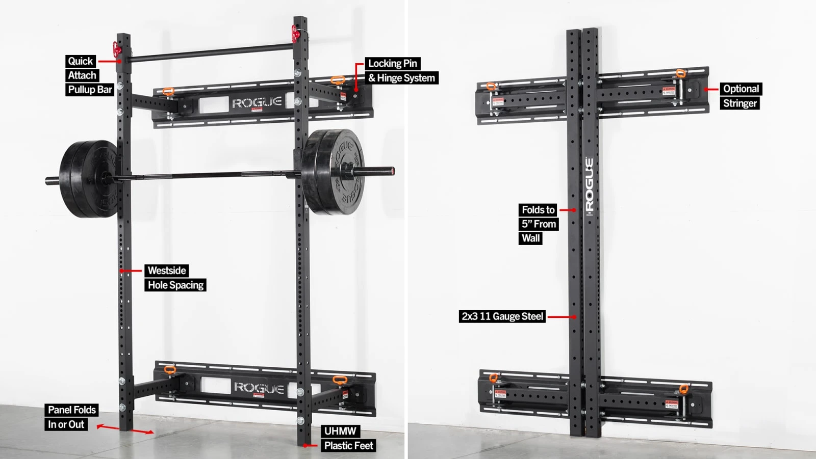 The goal with the R-3W was to develop a wall-mount unit that could be folded inward or outward for space efficiency, yet still offer the sturdiness of our standard Infinity Series racks. To achieve this, our engineering team developed a unique hinge-and-pin system that is both easy to install and rock solid. In use as a squat stand, pull-up rig, or power rack, the feel is miles beyond lighter fold-back setups that use thinner steel.