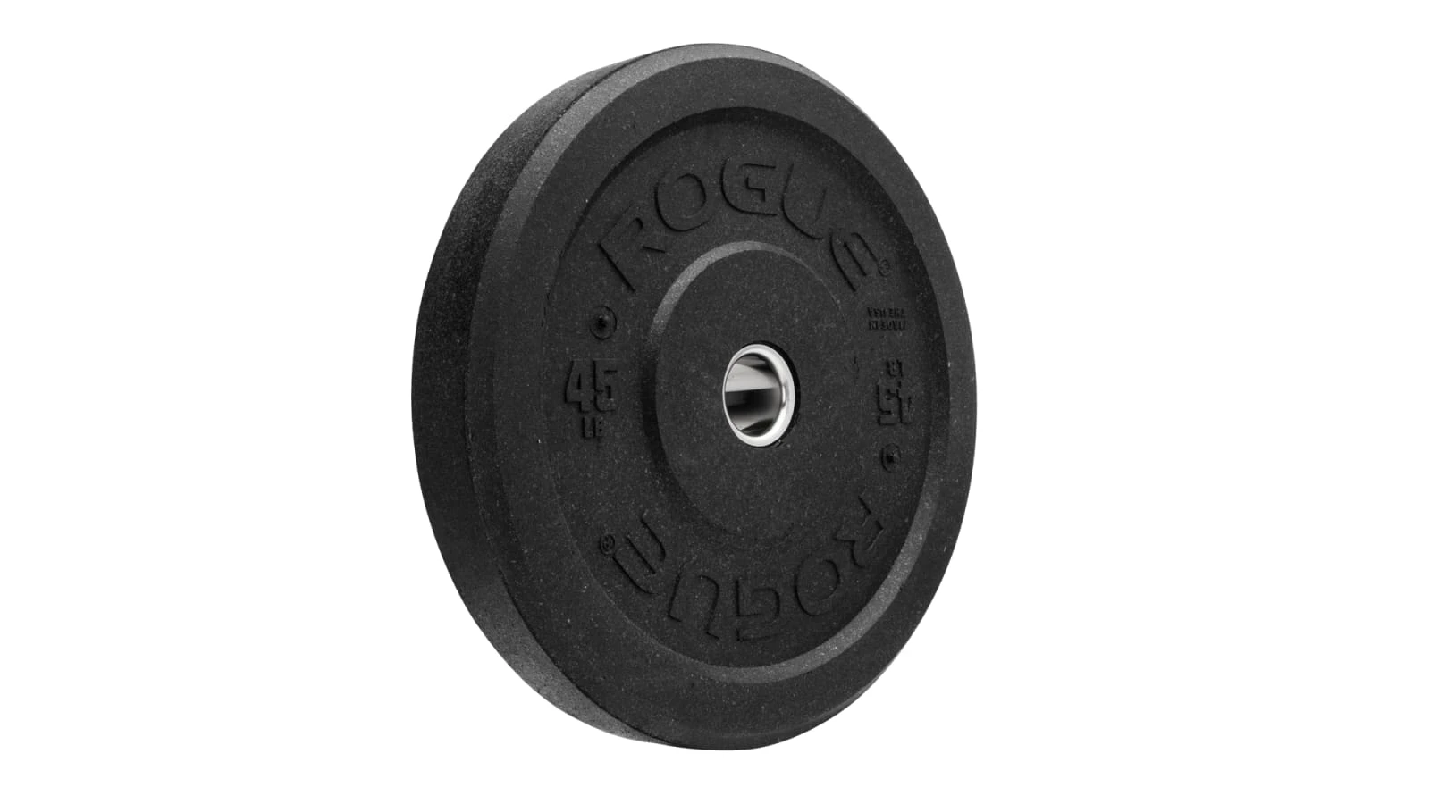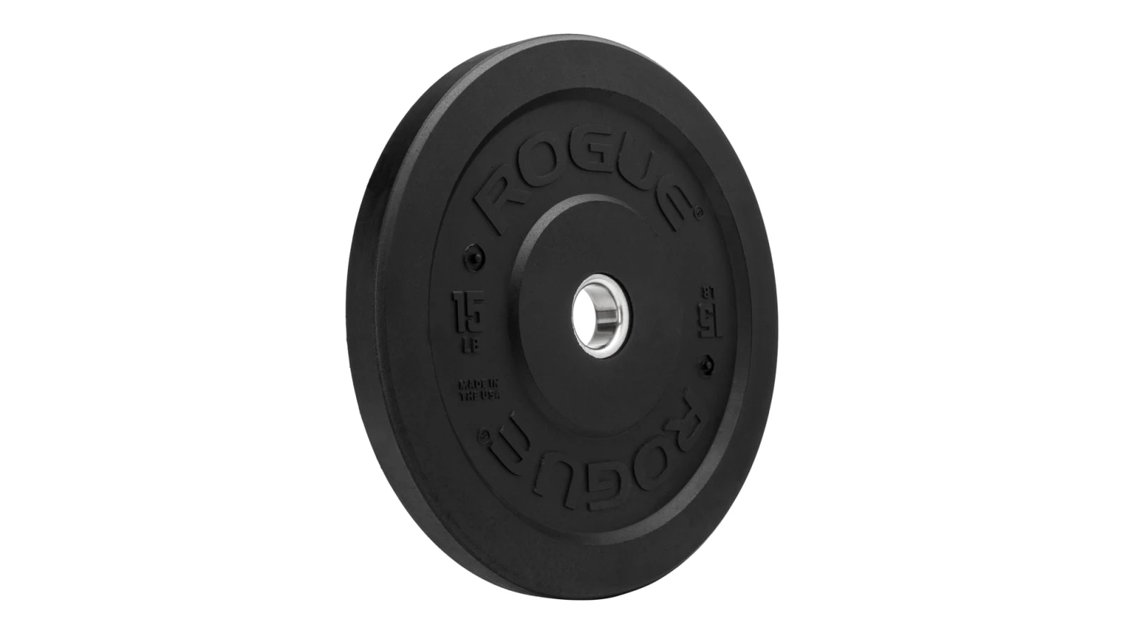 The improved finish is all-black with embossed Rogue branding and weight indications. The shore A durometer rating is approx. 80 and the weight tolerance is +/- 2% of the indicated measurement.