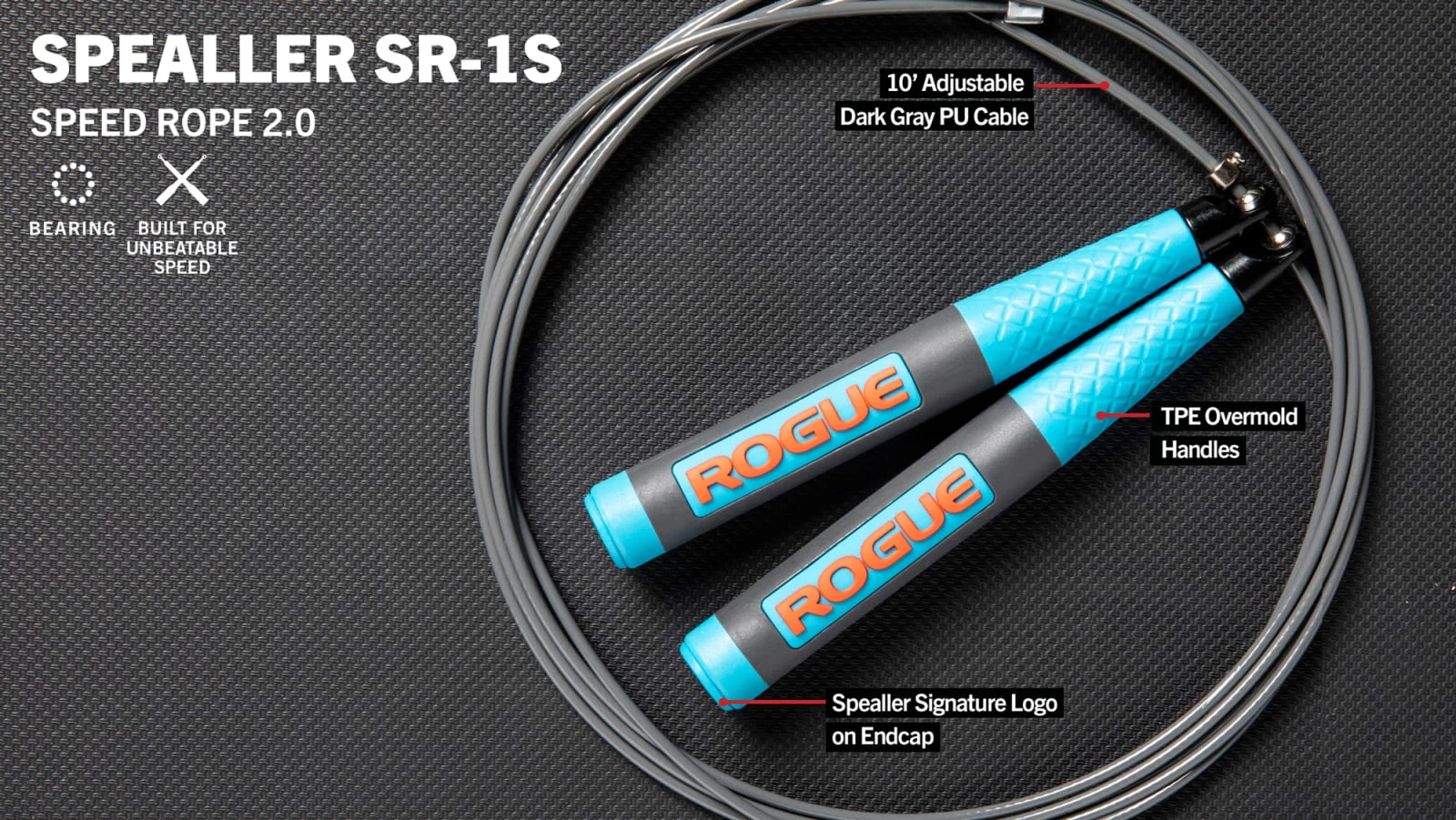 Version 2.0 of the Spealler SR-1S Speed Rope also includes a new look, with a dark grey coating on the cable and overmold, laser blue handles, Rogue logo badges, and an exclusive endcap featuring the Chris Spealler “7-Fire” logo.