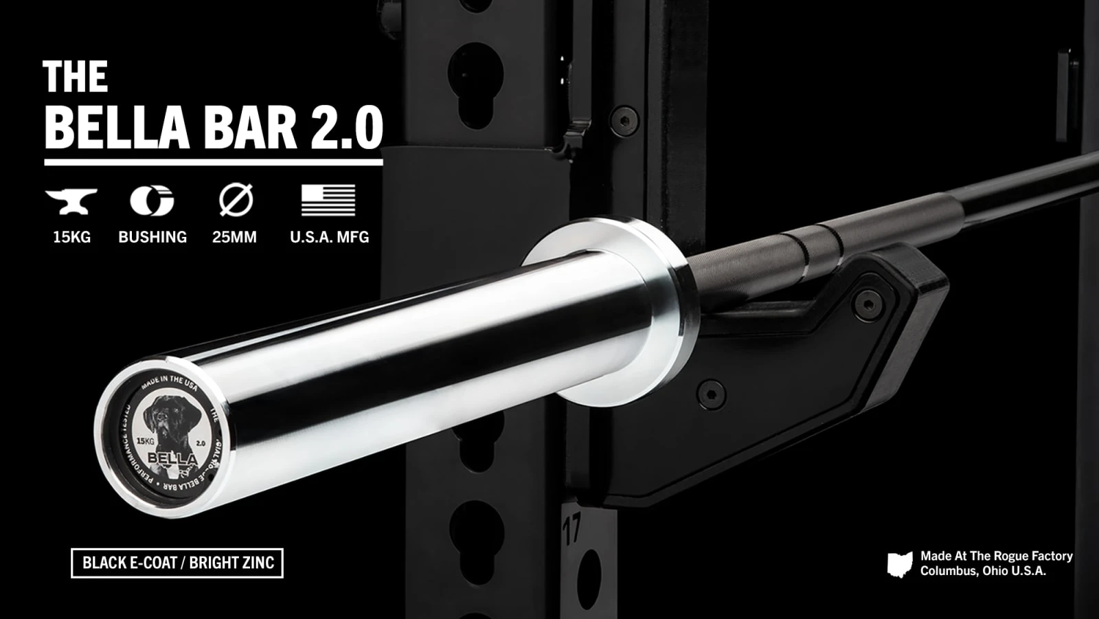 Like all Rogue Bella Bars, the E-Coat model is fully machined and assembled in Columbus, Ohio. It includes a 190,000 PSi tensile strength steel shaft, dual knurl marks (no center knurl), and bright zinc sleeves. The hybrid knurling pattern offers a firm but comfortable grip on both Powerlifts and Oly lifts, and quality bronze bushings help create the perfect balance of rigidity + natural whip.