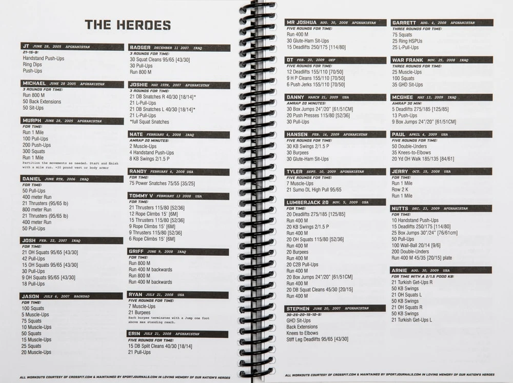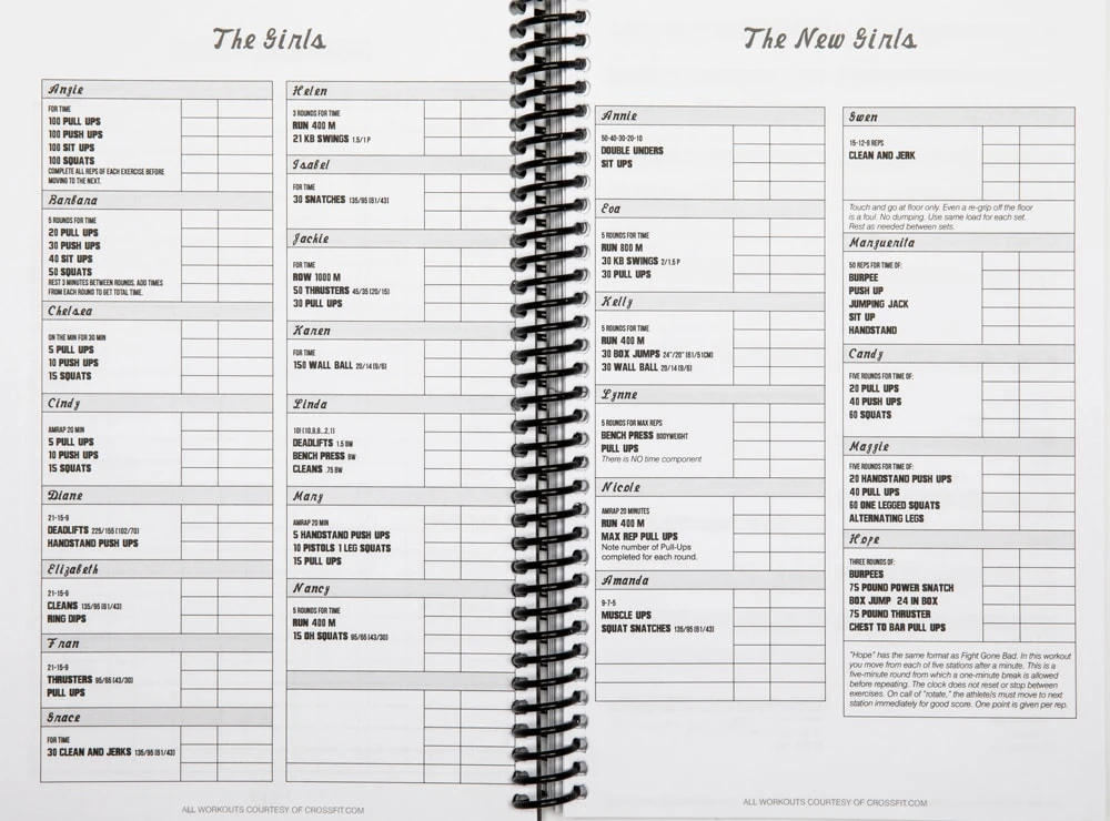 - WOD Log – Includes room to track scores for girls, heroes, travel workouts, Games WODs and other benchmarks