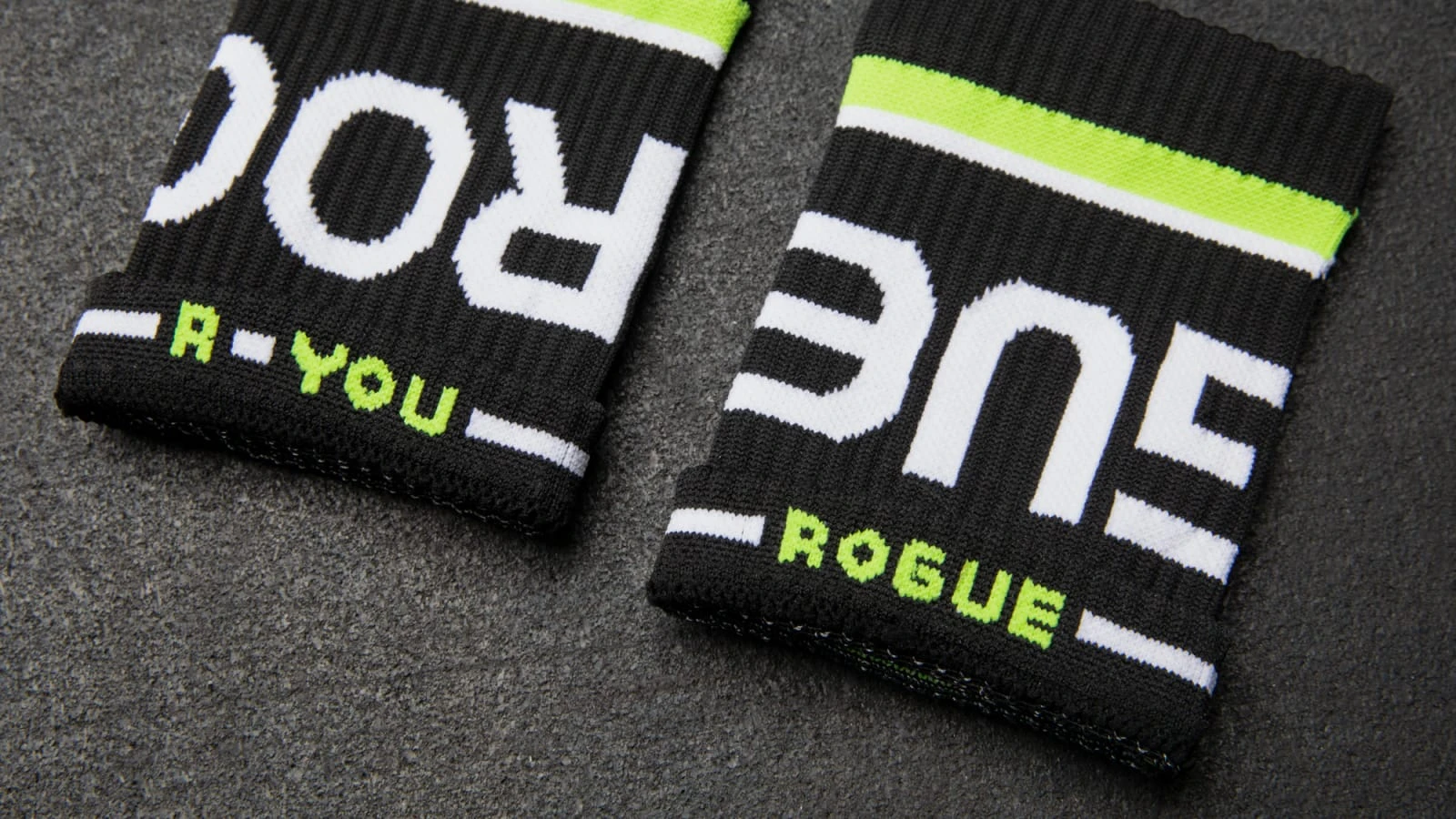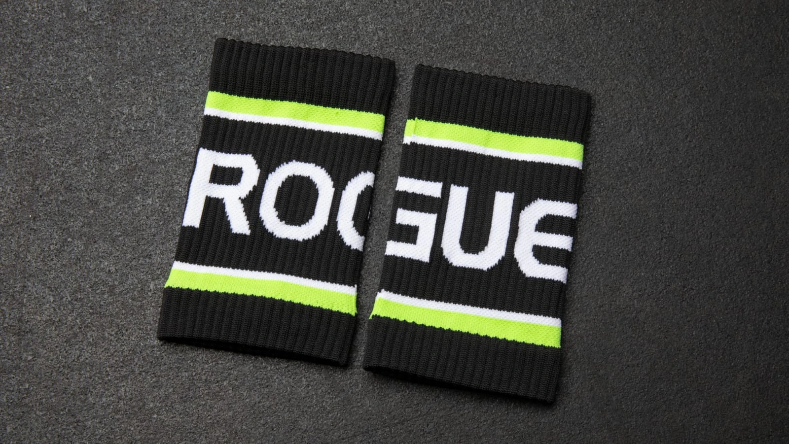 These quality, one-size-fits-all Rogue Wrist Bands are produced by Skyline Socks of Seattle, Washington, and feature the Rogue logo in a wrap-around, Black / Neon Green design. Comfortable, breathable, and flexible, these all-weather sweatbands are the simple, good-looking way to keep your hands dry and your regimen in motion.