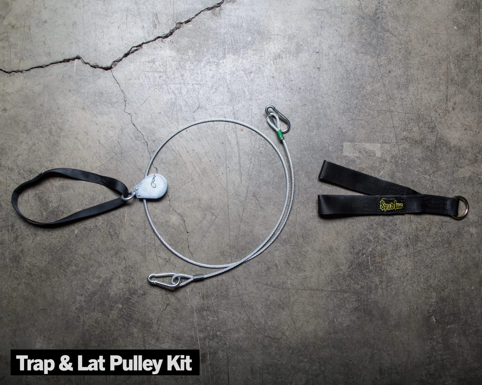 Triceps & Lat Pulley Set: (1) Cable: 75″ long, 0.25″ diameter, (1) 18″ Loading Strap Pin, (1) Short Triceps/Ab Strap, (1) 2.5” Swivel-Eye Pulley, (2) 0.375″ Spring Clips.