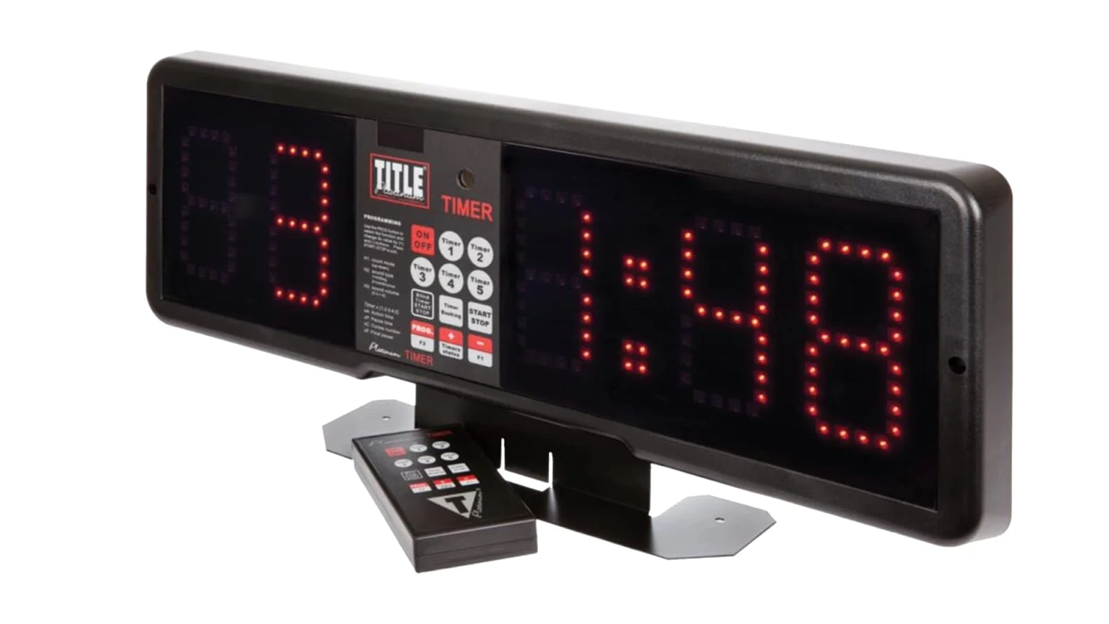 The Title Platinum Professional Fight & Gym Timer is great for small and large gyms alike, offering superior visibility with a 4” tall display; four adjustable volume settings; and a multitude of custom programmable options. The lightweight unit measures 22” x 7” x 1.5” and can be secured on the included stand or mounted to a gym wall. A remote control is provided for convenient wireless setting changes from as far as 50 feet away.