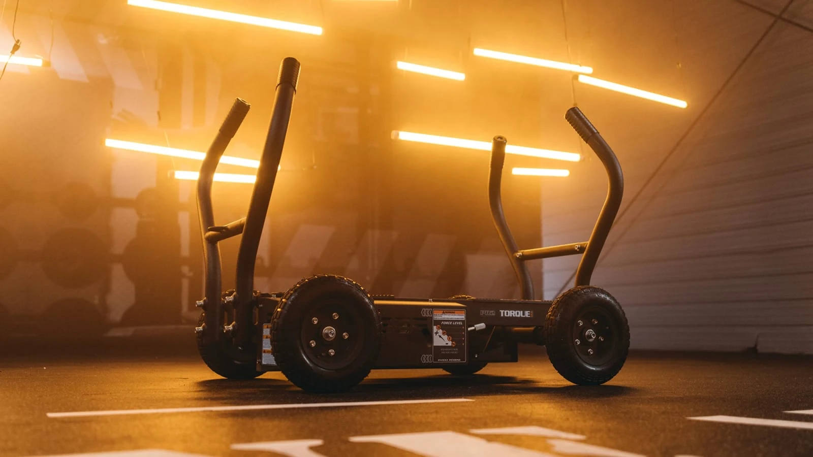 The TANK™ M4 from Torque Fitness is another variation on Torque’s game-changing push sled on wheels. Rather than relying on friction-based resistance like most weighted sleds on the market, the TANK™ operates more like a fan bike, with a magnetic + flywheel design that automatically increases resistance as the sled is pushed faster; with no need to stop and load or unload plates. Because the TANK’s steel frame sits on four oversized, all-surface tires, the sled can also be used indoor and outdoor, from turf to pavement, producing far less noise than friction sleds and no gouging! Its electrostatic paint finish also protects it effectively from the elements.